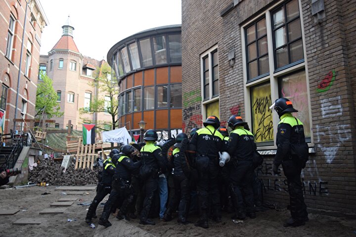 Gazze’deki Filistinlilerle dayanışmalarını göstermek amacıyla Hollanda’daki üniversitelerde başlayan protestolara polis müdahalesi sürdü. Hollanda’da Amsterdam Üniversitesi (UvA) ve Utrecht Üniversitesinde başlayan eylemlere polis sert şekilde müdahale etti. Polis, göstericilerin kamp kurduğu Amsterdam Üniversitesine ait Binnengasthuis binasına giden tüm yolları yaya ve araç trafiğine kapattı.